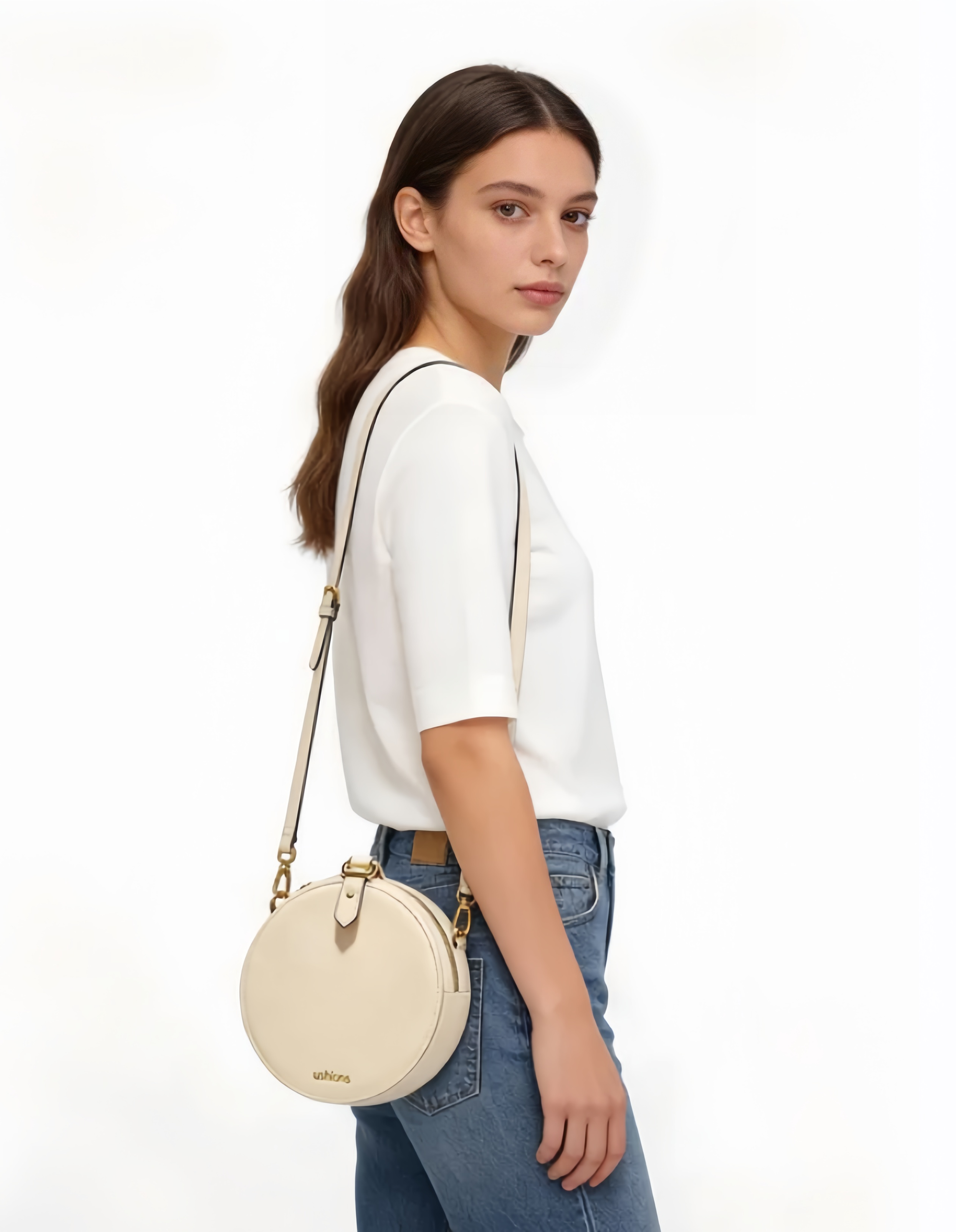 There’s something quietly confident about carrying a bag that says more with less. This circular crossbody is designed for those who appreciate clean lines and timeless materials — a soft beige leather body shaped into a sleek round silhouette that feels modern yet familiar.